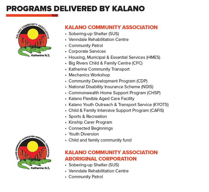 Kalano Community Association Inc. (KCAI) is an Aboriginal-owned and controlled organisation that delivers social services, economic development opportunities, and housing to its members in Katherine and the surrounding communities.